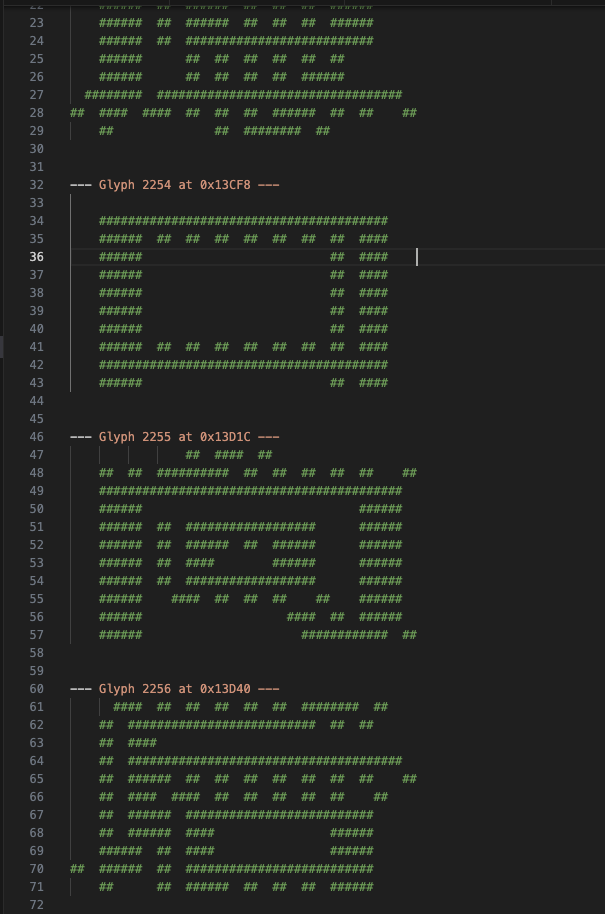 - **36 bytes per glyph** (24 pixels wide x 12 rows, 1 bit per pixel)